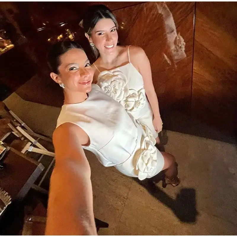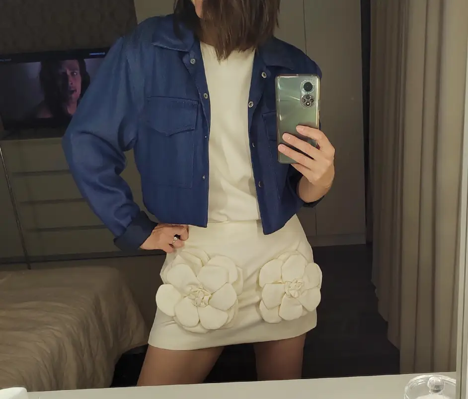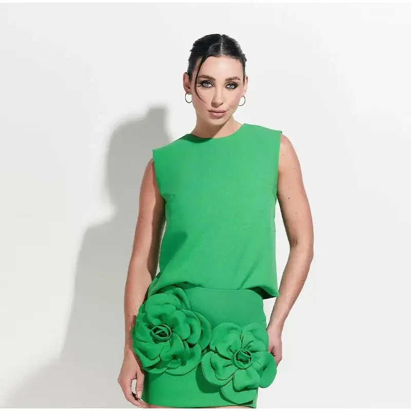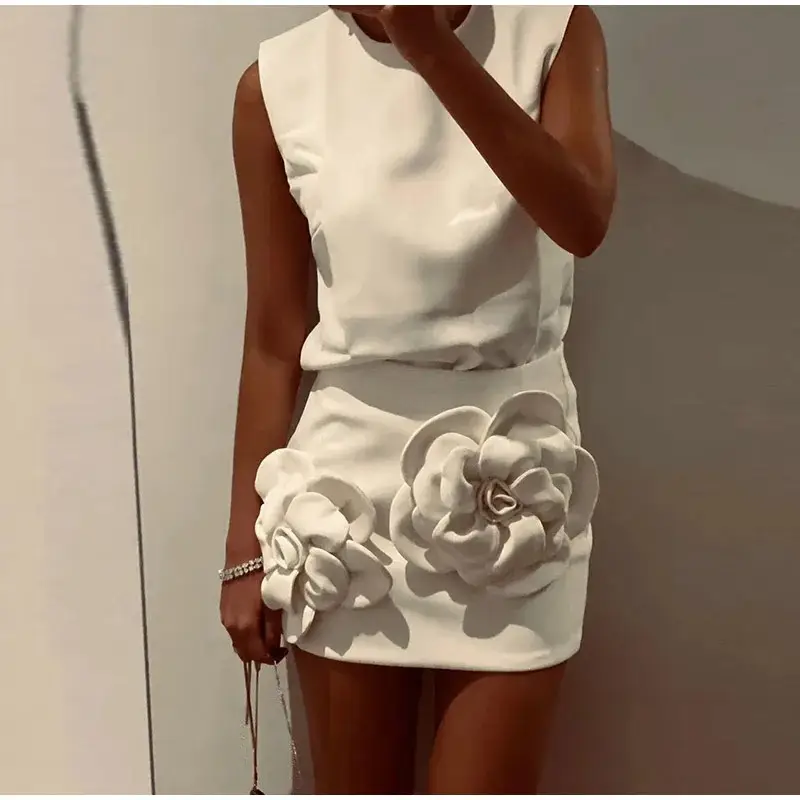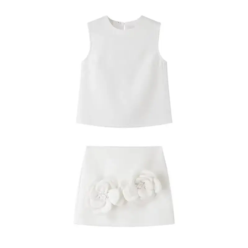 Komplet damski bluzka i spódniczka mini z naszytymi kwiatami